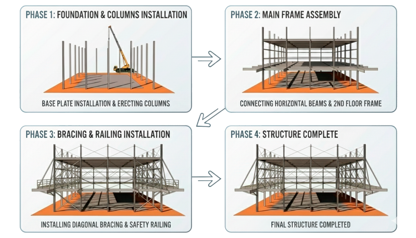 철골 구조물을 공원 양옆 가로수 라인 안쪽으로 설치하여 자연스럽게 경기장과 관람석을 겸하는 긴 터널 형태 또는 가로수 길 끝에 만나는 팝업 경기장을 만든다. 모듈성은 설치와 철거가 며칠 만에 가능하여 팝업 행사에 최적화한다.