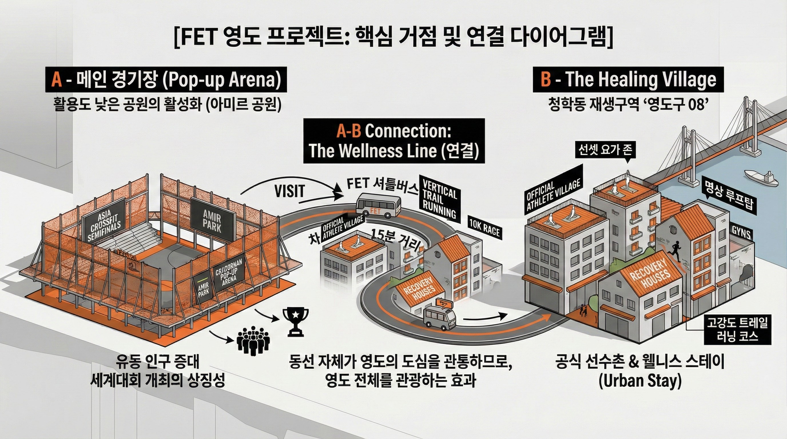 ② 힐링 빌리지 (청학동/봉산마을) : 가파른 언덕과 골목길은 그 자체로 훌륭한 트레킹 훈련 코스가 된다. 빈집들을 리모델링해 운동 후 바다를 보며 회복할 수 있는 '웰니스 숙소(Ocean View Recovery)' 로 탈바꿈시킨다.